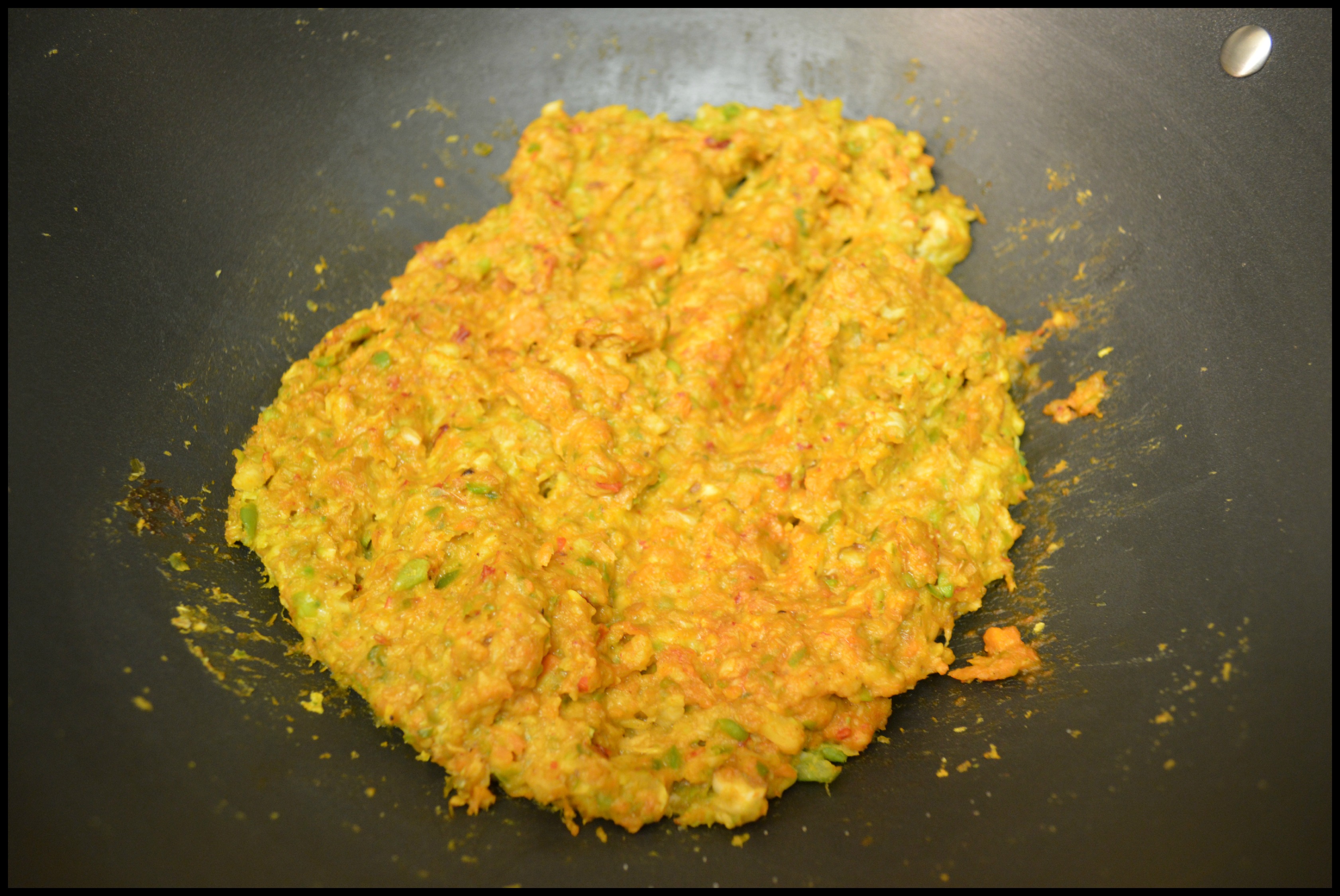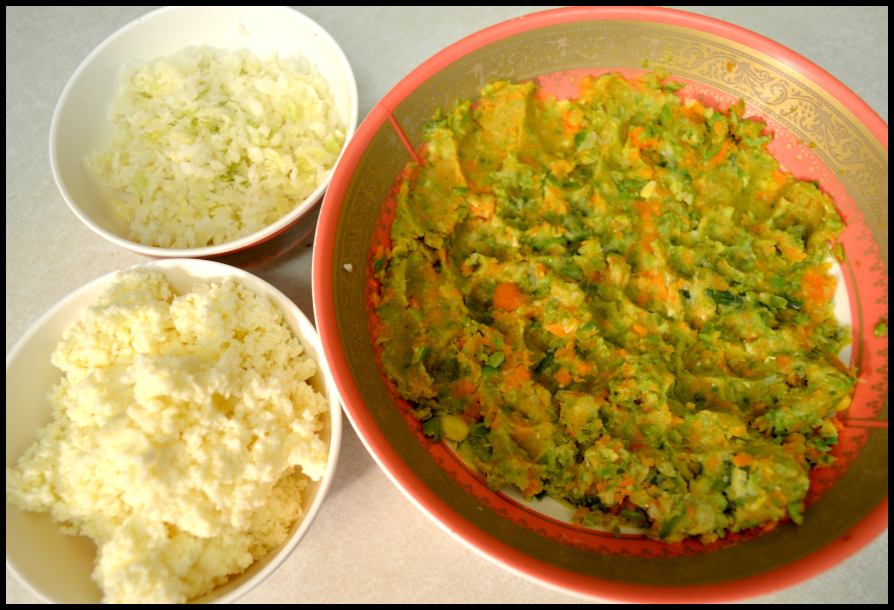 Step 3: To prepare the filling, I placed my vegetables in the processor to mash them up a bit. I grated my cabbage and paneer too. Alternately, you can finely chop your vegetables.