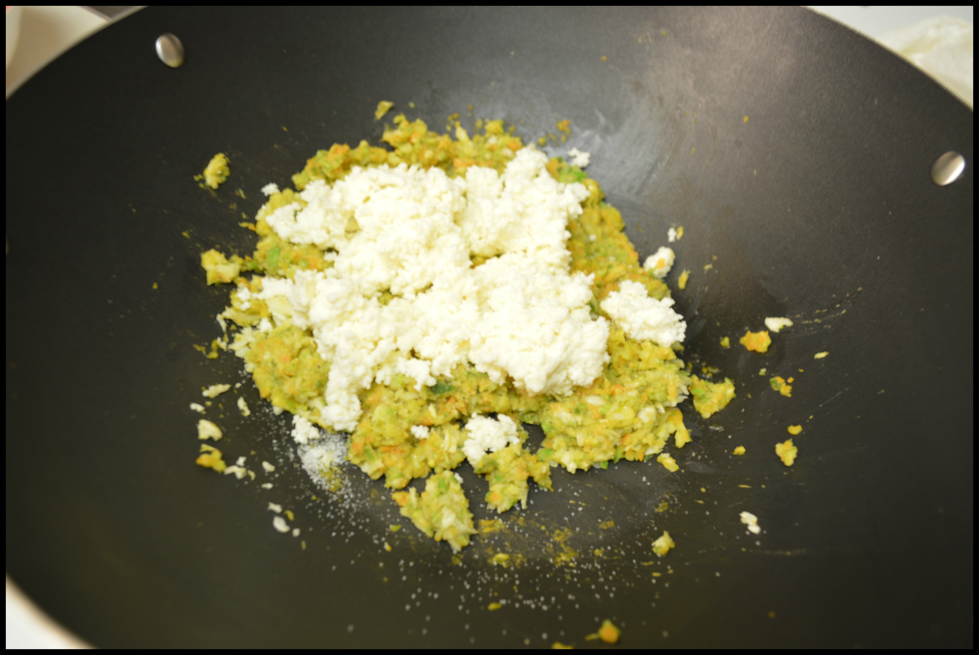 Step 4: Heat the oil in a wok. Add the vegetables and paneer, along with the salt and pepper. Next, add in your favorite sauce and stir well. Make sure not to overcook! Turn off the heat and let the filling cool.