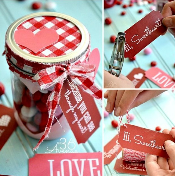 You probably know how easy it is to work with mason jars, and for this next DIY all you need to do is create a cute label with a love note, paste it on the jar and fill it with treats of your choice! The best part about this gift is the fact that you can customize it according to the preference of your valentine. If the person is a sweet lover-fill it with candies or caramel bites or choco bars, for a tea lover you can place assorted tea bags and cookies, for a health nut you can add almonds, pistachios and sunflower seeds.