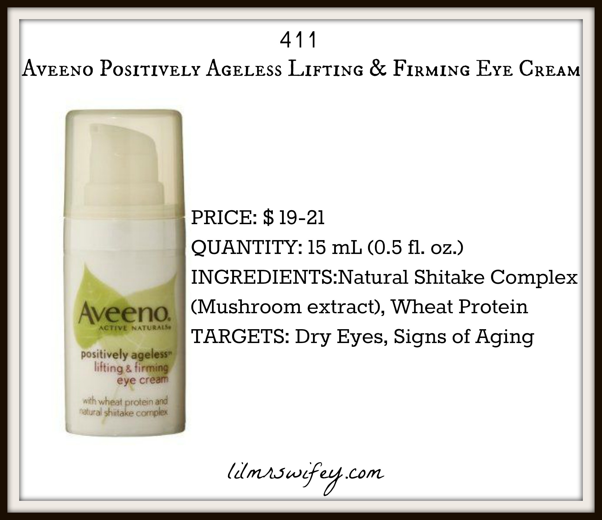 New product on your shopping list, in two minds about what to choose and what to chuck..Lil Mrs Wifey to the rescue! Here is my 411 on the Aveeno Positively Ageless Lifting & Firming Eye Cream. PS-Not a sponsored post, honest opinions only^_^v